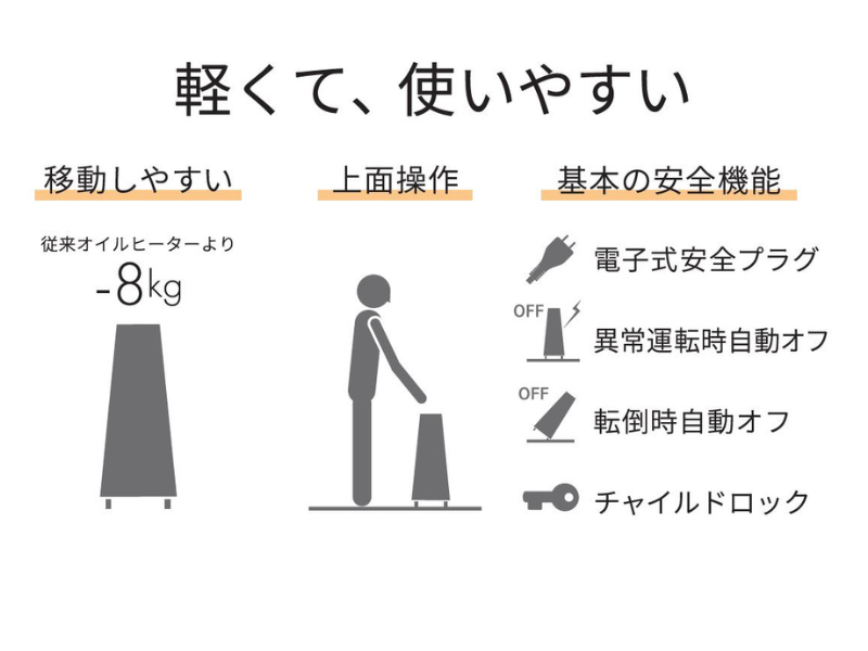 主な安全機能 | 電子式安全プラグ / 異常運転感知 / 転倒時自動オフ / チャイルドロック | |